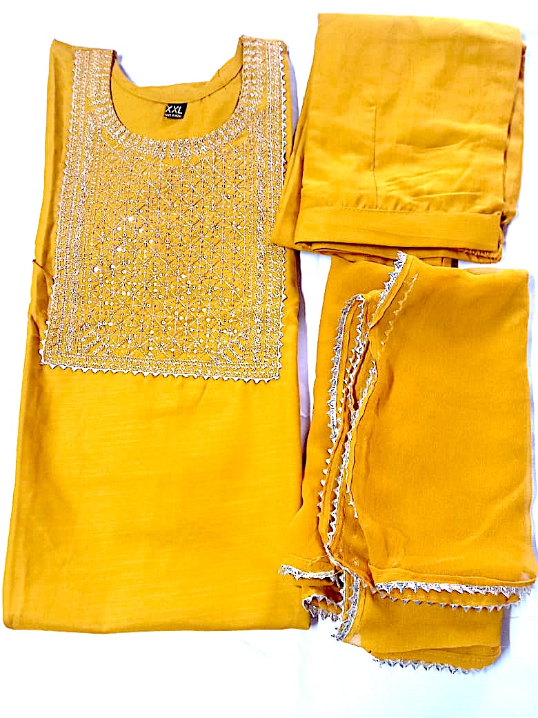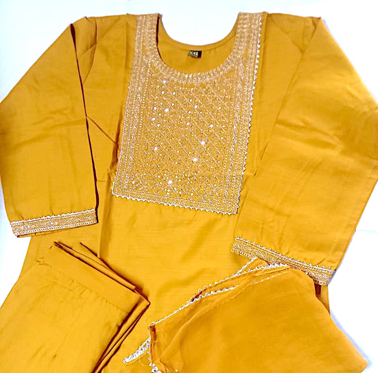 Elevate your ethnic wardrobe with this stunning yellow cotton Salwar Kameez set. This three-piece ensemble features exquisite lace embroidery work on the yoke, adding a touch of traditional elegance to your look. The bright yellow shade brings a cheerful vibrancy that's perfect for festive occasions and celebrations. The set includes a gracefully designed kameez (top), matching salwar (bottom), and coordinating dupatta, all crafted from comfortable cotton fabric. The intricate white lace detailing on the sleeves and neckline creates a beautiful contrast against the yellow base. The straight-cut silhouette of the kameez ensures a flattering fit for various body types, while the cotton material provides excellent breathability and comfort throughout the day. Perfect for both casual gatherings and semi-formal events, this ensemble combines traditional craftsmanship with contemporary styling. Hand wash recommended to maintain the garment's beauty.